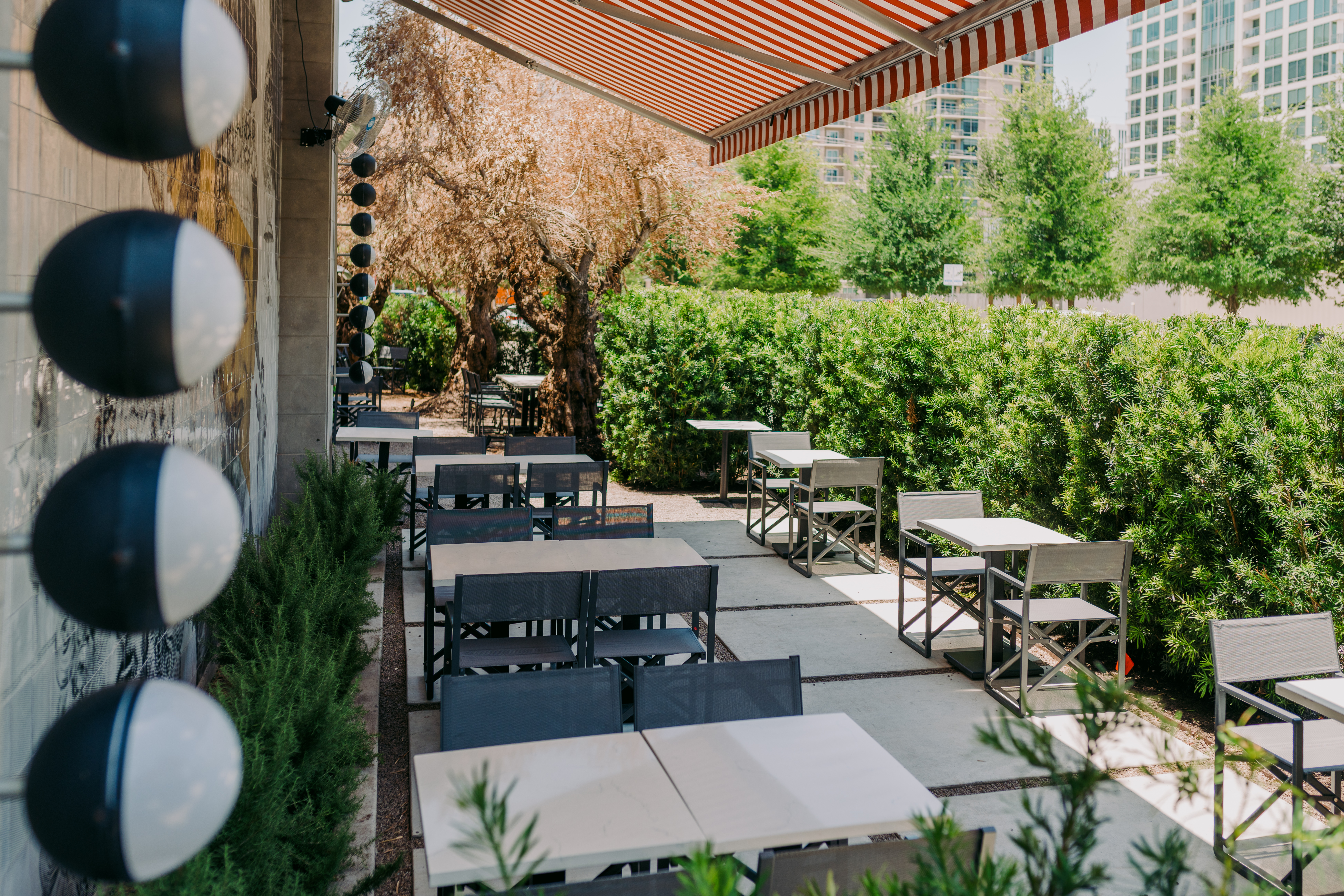 Nestled beside MAD's vibrant, art-covered walls and lush greenery, The Garden is a lively outdoor space ideal for private events. With string lights, bold tile murals, and a striped canopy, it seats up to 48 or 60 standing. Perfect for receptions, birthdays, or corporate gatherings.